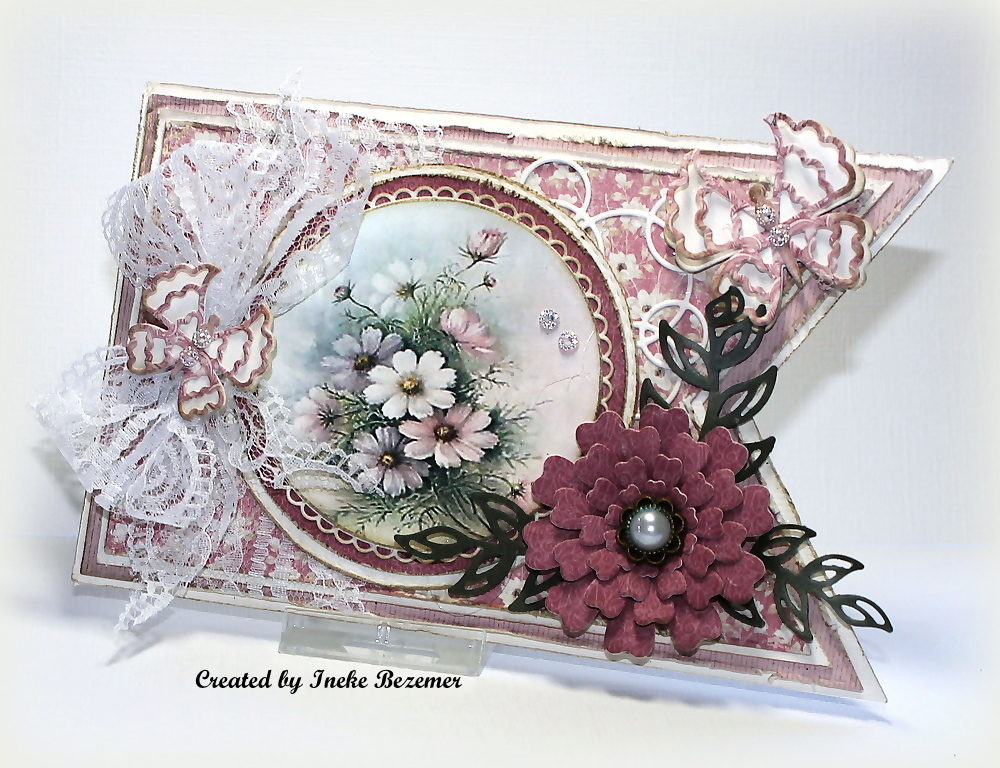 Ook de binnenkant heb ik bekleed met het mooie designpapier en heb er de mooie wereldbol bij toegevoegd, die ik uitgestanst heb met mooi Tonic karton. Natuurlijk heb ik weer foam bloemen gemaakt. zo fijn om te doen. De snijmallen van de bloemen zijn van Leane.
